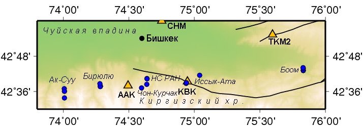 За время экспедиции было осуществленно 408 измерений зеркал скольжения на более 20 точках Киргизского хребта. На карте эти точки отмечены синим цветом.